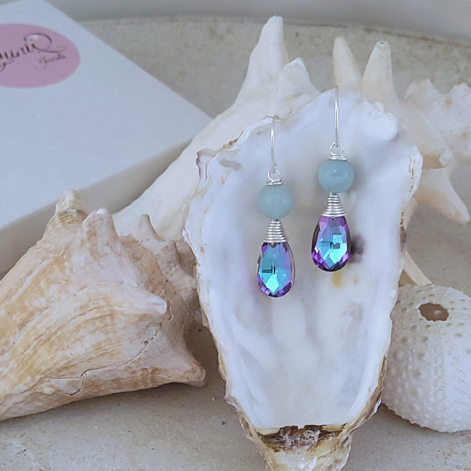 Sterling silver earrings with amazonite, combined with a crystal drop with different shades of blue and lilac