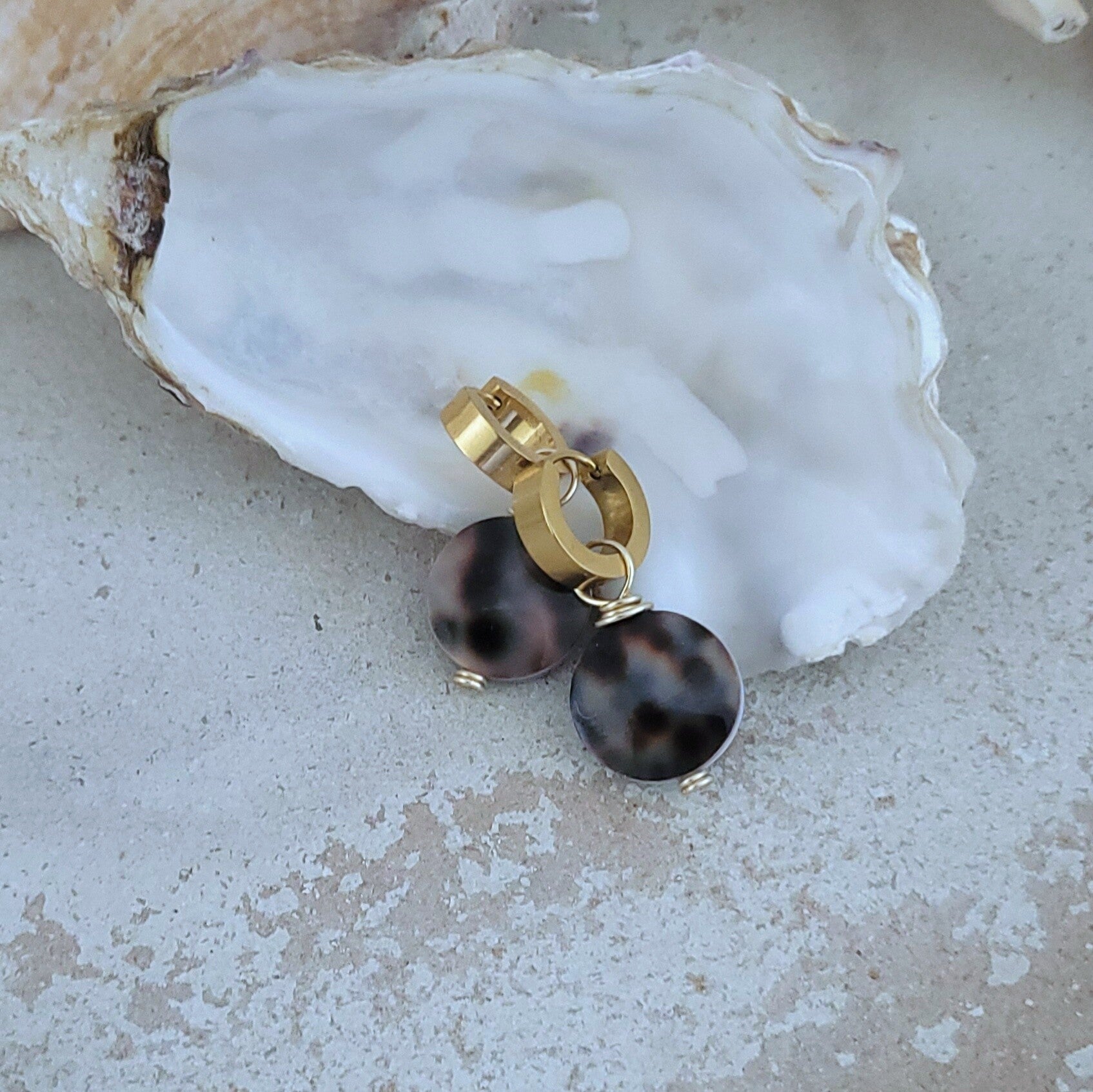 Stainless steel hoops with a cowrie shell and non tarnish gold plated wire.